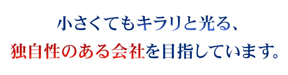 私たちの目指す姿は、「小さくてもキラリと光る、独自性のある会社」です。お客さまに寄り添いながら、理想をカタチにする実現力を持ち、確かな仕上がりを提供することを目指しています。